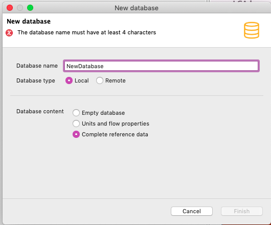 The error message 'The db name must have at least 4 characters' starts with a first character for the name field remains and the Finish button is greyed out. Many characters don't work, the only change is when unaccepted characters are entered. Trying other options on DB type or Content do not have an effect. Uninstalled, tried a different version etc.