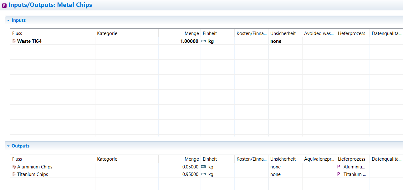 I have created a waste process that has as flow once aluminum and once titanium with different weights. I also created their provider processes by taking the elementary flows from a given aluminum and titanium process from the database.