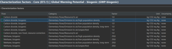 PS: Why are these flows called "biogenic" and not "non-fossil" in your screenshot, since we harmonized these namings with ecoinvent and in the EN15804 add-on they are called "non-fossil"? The choice of the naming is not important, I just ask out of interest. Maybe you added the method to a different/older database without overwriting the flow names during import?