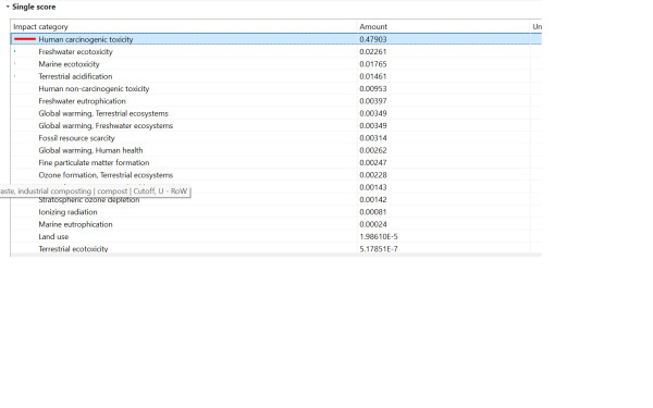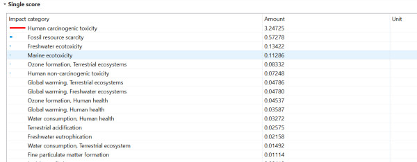Hi! I being calculating weighted results using OpenLCA 2.4 , ecoinvent 3.11 and Recipe 2016 Endpoint (H) using World (2010) H/H for several datasets (diesel production, diesel burning, waste treatment, electricity generation) and always the impact category Human Carcinogenic toxicity has the higher contribution.