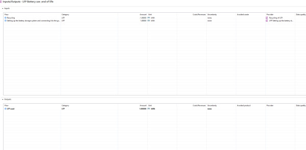 I don’t understand how to model recycling with ecoinvent in OpenLCA. The attached images show my attempt. However, my understanding was that recycling should reduce the battery’s GWP, but in my results it only increases. It seems as if the recycling outputs are not being considered at all. I’m very confused and unsure how to proceed. Or are there other ways to model recycling? I am a beginner in OpenLCA.