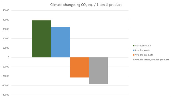 Below is a figure illustrating the Climate change impact of 1) using no substitution at all (spent batteries are used in the input without the "avoided waste", and a full basket-of-products with no "avoided products" in the output, 2) "avoided waste" only for the spent batteries in the input, 3) "avoided products" only for the Ni and Co by-products, and 4) "avoided waste" for the spent batteries in the input and "avoided products" for the Ni and Co by-products in the output. No allocation was used in any of the cases.